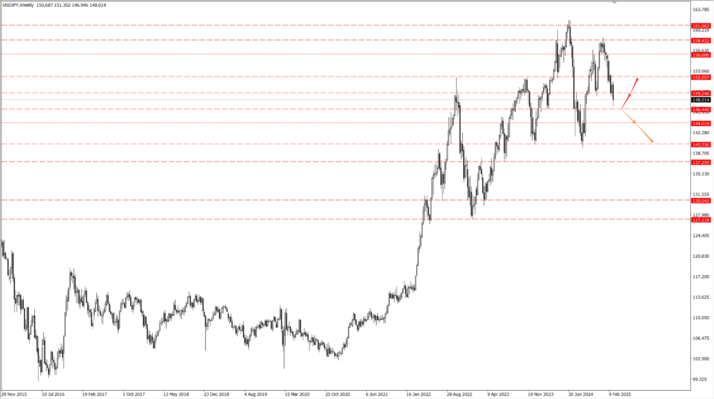 - Last week, USD/JPY continued its downward trend, with bearish momentum remaining dominant.