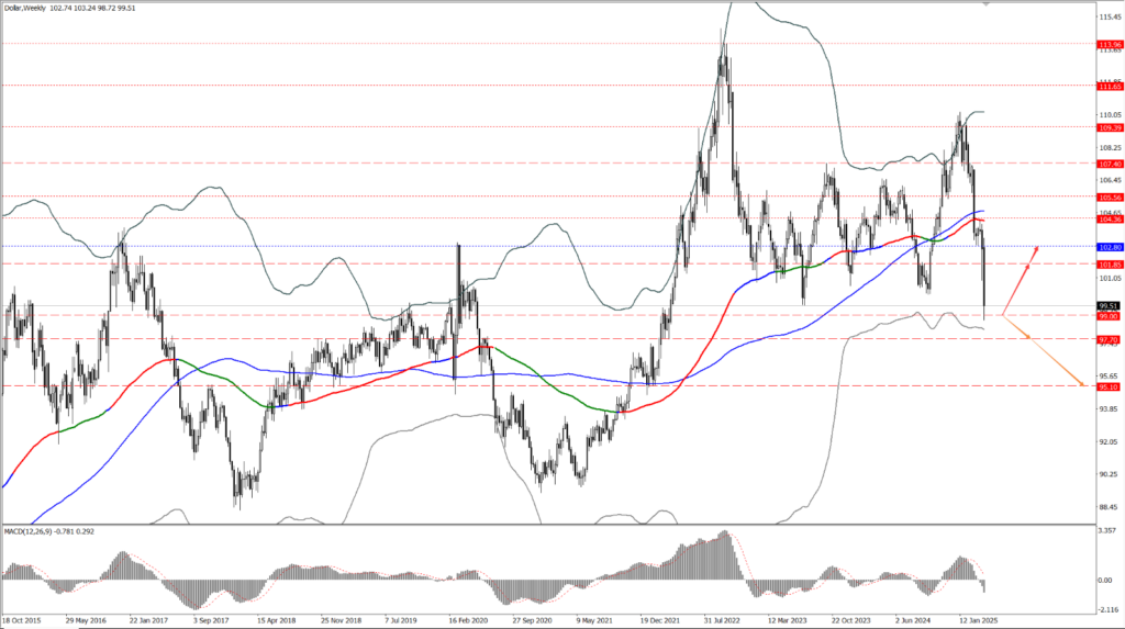 - If the index breaks below 99 with momentum, monitor support levels at 97.70 and 95.10, with particular attention to the 97.70 level.