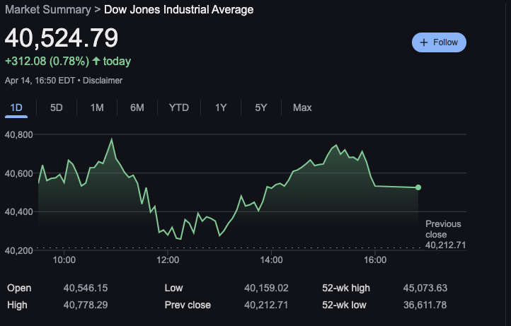 The major U.S. indices rallied Monday on the back of President Trump’s tariff reprieve for tech products. Apple led the charge, jumping 2.2%, while the Dow added over 300 points.
