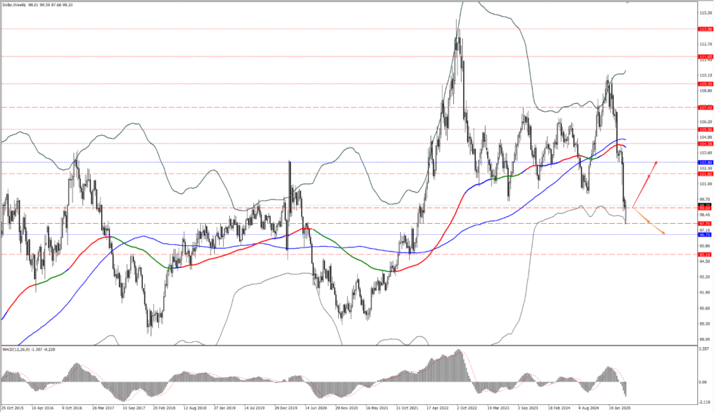 • Bullish Scenario: If the DXY stabilizes above 99, resistance levels to watch are 101.85 and 102.80.