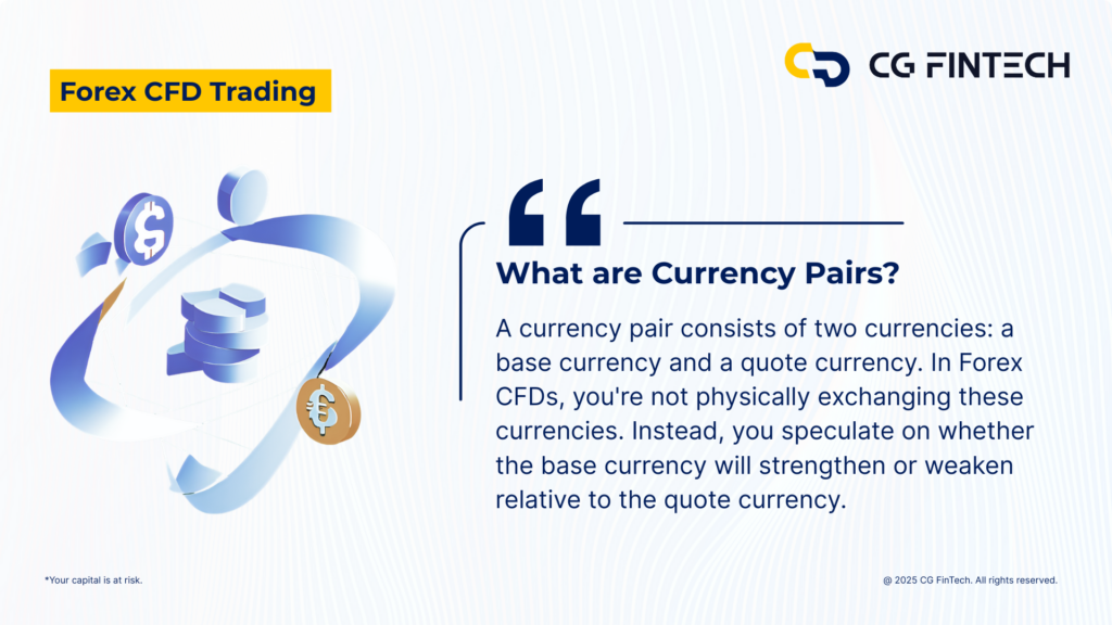 A currency pair consists of two currencies: a base currency and a quote currency. In Forex CFDs, you’re not physically exchanging these currencies. Instead, you speculate on whether the base currency will strengthen or weaken relative to the quote currency.