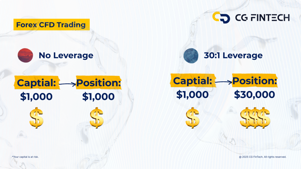 - Example: With 30:1 leverage, a $1,000 margin controls a $30,000 position.