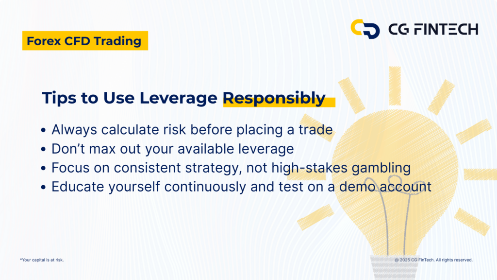 Leverage is one of the most powerful—and dangerous—features of Forex CFD trading. It allows traders to control large positions with relatively small capital. But without the right understanding and risk management, it can quickly wipe out an account. In this guide, we’ll walk you through everything you need to know to use leverage safely and strategically.