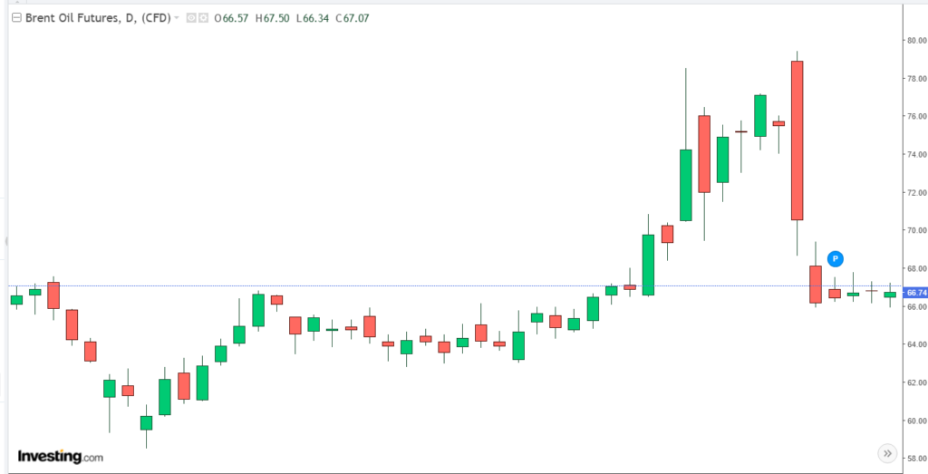 Oil markets saw wild swings, with Brent crude dropping 8% intraday to as low as $66/bbl before rebounding above $70.