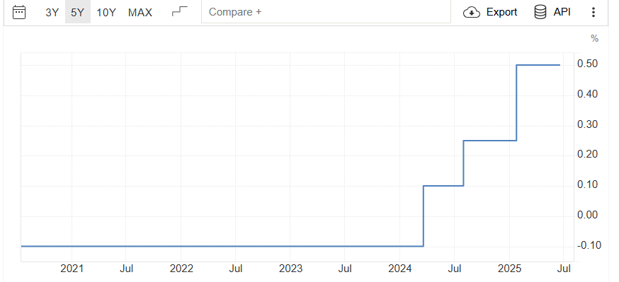 The Bank of Japan kept policy steady at 0.5%, yet signaled a cautious pivot. In their June meeting, they confirmed a slower pace of bond purchase reduction—cutting monthly JGB tapering from ¥400B to ¥200B starting April 2026. Governor Ueda emphasized that rate hikes remain on the table, conditional on wage and inflation trends.