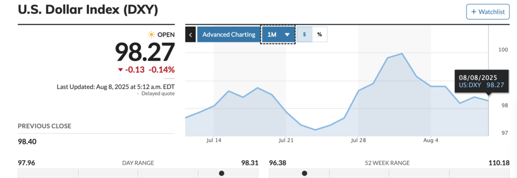One of the week’s most dramatic moves was in currency markets. The U.S. Dollar Index (DXY) surged to a ten week high as a crowded short dollar trade flipped violently. Hedge funds and macro desks that had been betting against the dollar were forced to unwind, driving a rally that hit emerging markets and commodities hard.