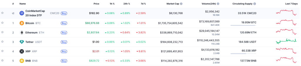 Bitcoin bounced back modestly to 86,944 after a sharp slide earlier in the week, but the crypto market remains jittery. Ethereum continued to edge down toward 2,808. The recent selloff in digital assets has been attributed to rising global yields and reduced appetite for high-volatility instruments.