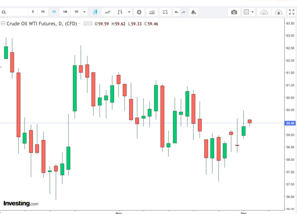 Oil prices showed modest gains, with WTI crude trading around 59.40 per barrel. While that marks a slight rebound, crude remains near the lower end of its 52-week range. Traders are weighing global demand signals against the potential for supply-side disruptions, particularly heading into winter and year-end production decisions.